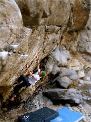 Mavericks v5 - an excellent boulder with a flat landing and a exciting top out.